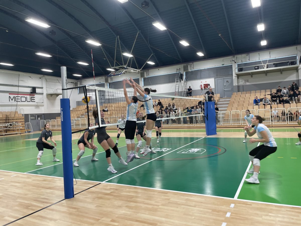 Odločilna tretja tekma je znova napolnila tribune ŠD Marof. Dvoboj med Gimnazijo Novo mesto in Gimnazijo Nova Gorica je odločal o uvrstitvi v polfinale. Varovanke trenerja Marka Bartlja so v tekmo vstopile zbrano in samozavestno. Videli smo številne lepe akcije ter izjemno hitre zaključne udarce naših igralk. Tudi nasprotnice niso popuščale, a prvi niz je pripadel domačim.