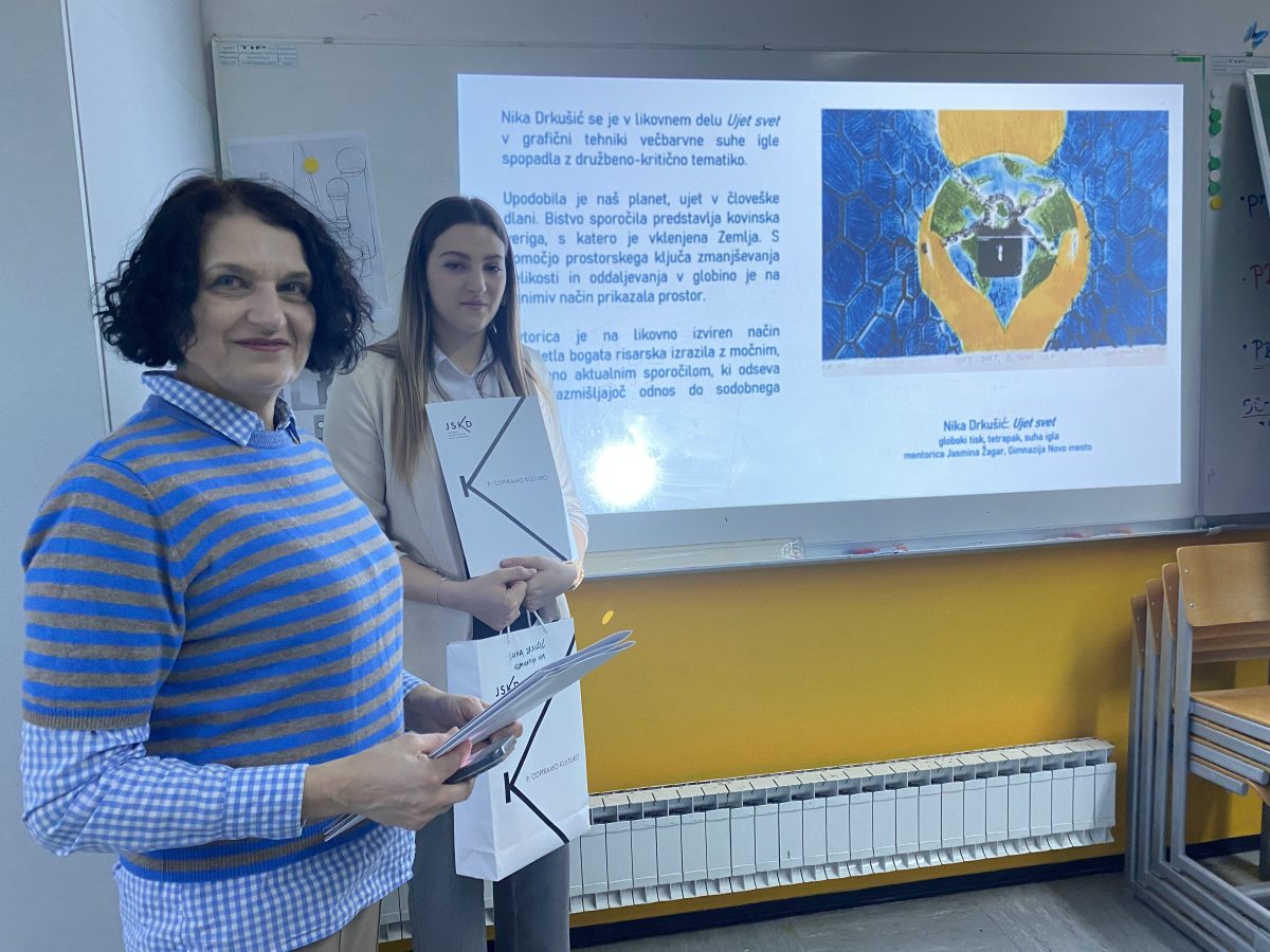 Na spletnem likovnem in fotografskem natečaju Mesto stika, ki ga organizira Javni sklad RS za kulturne dejavnosti, je naša dijakinja Nika Drkušić prejela priznanje in nagrado v kategoriji srednješolcev. Priznanje so ji slovesno podelili na Območni izpostavi JSKD Novo mesto, kjer sva se udeležili tudi ustvarjalne delavnice in si ogledali razstavo mladih likovnih ustvarjalcev v Galeriji Kocka.