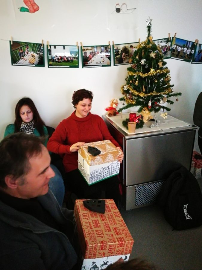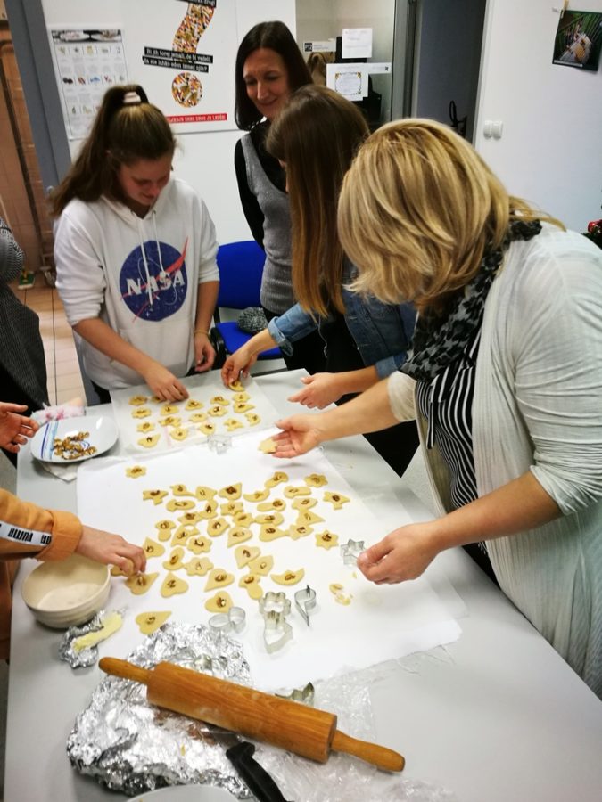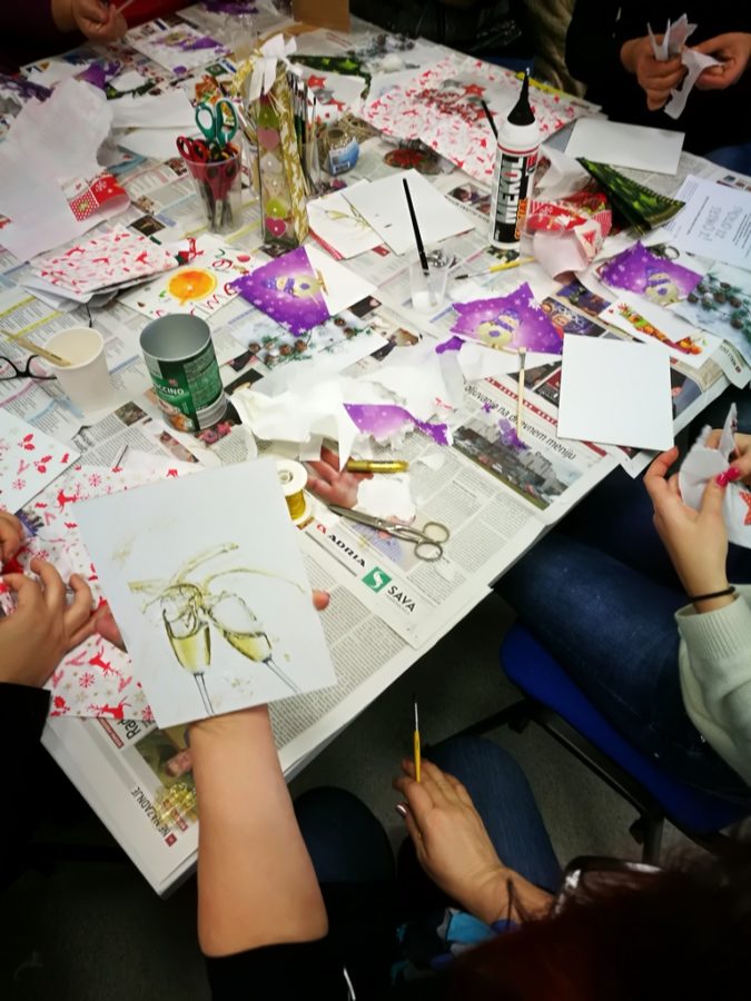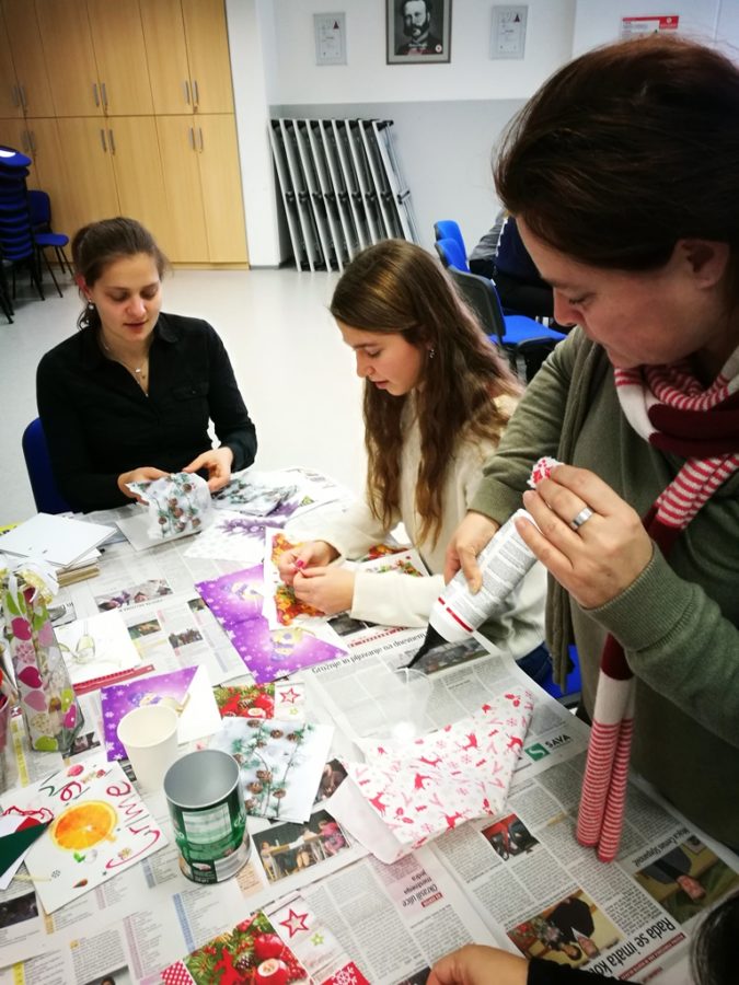 Vsi so se najprej pogreli s čajem, potico in pecivom ter se spoznali, potem pa so se po interesih družili in ustvarjali v treh delavnicah. V prvi so pekli medenjake z orehi, v drugi so izdelovali novoletne okraske, v tretji pa slike iz papirnatih prtičkov. V zadnjem delu srečanja so se zopet zbrali v veliki in topli jedilnici. Dijakinji Klara Jordan in Gaja Gregorčič iz 2. c sta zaigrali na kitaro in z izbranimi slovenskimi ter božičnimi pesmimi pripravili pravi kulturni program in k petju pritegnili vse udeležence srečanja. Na koncu druženja so dijakinje uporabnikom razdelile darila, Kreativne pa so razveselile z družabno igro.