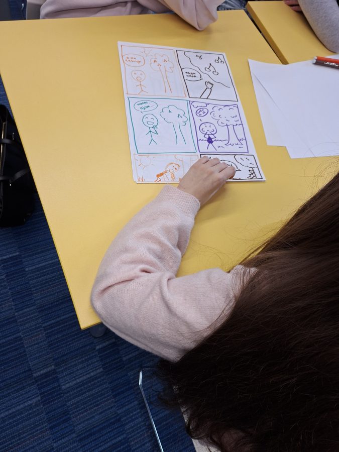 Zbrali smo se v Mestni knjižnici Ivan Goran Kovačić. Dijaki so si najprej ogledali razstavo Slovenski in hrvaški strip skozi čas, imeli so tudi priložnost doživeti VR stripovsko izkušnjo. Sledila je stripovska delavnica z Ivanom Mitrevskim in Krešimirjem Biukom. Nastala so zanimiva dela, ki si jih bo mogoče ogledati v šolski knjižnici. Za predah od stripa smo si ogledali razstavo Maria Romode v sosednji Galeriji Vjekoslav Karas. Dan smo zaključili z izjemnim predavanjem Dejana Šiptarja o zgodovini stripa.